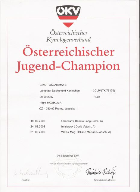 Ciko byl přihlášen do mezitřídy a v konkurenci tří jezevčíků získal hodnocení Výborná 1, CAC VDH, res CAC DTK a později ještě jako třešničku na dortu i titul res. CACIB