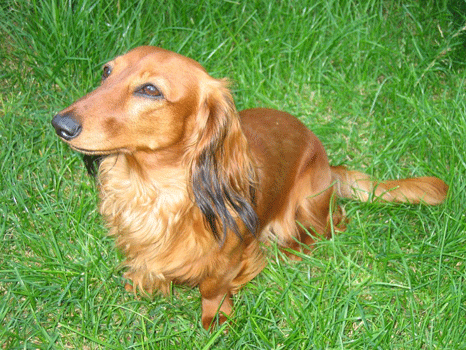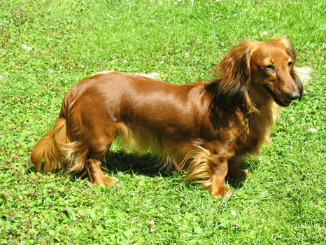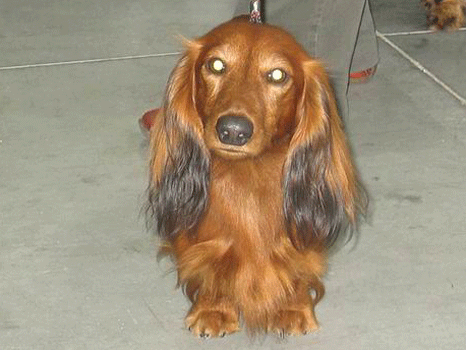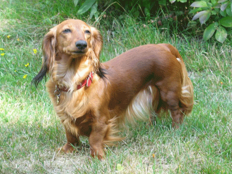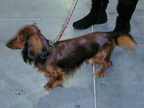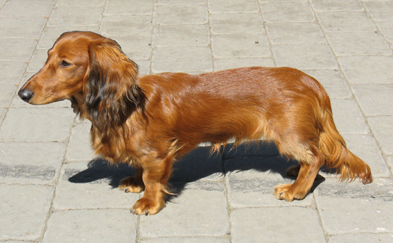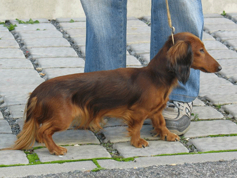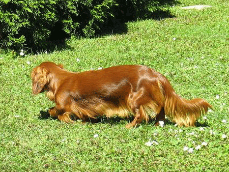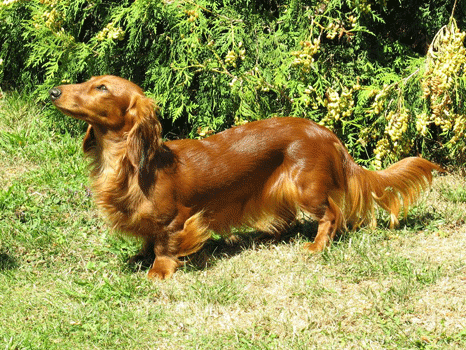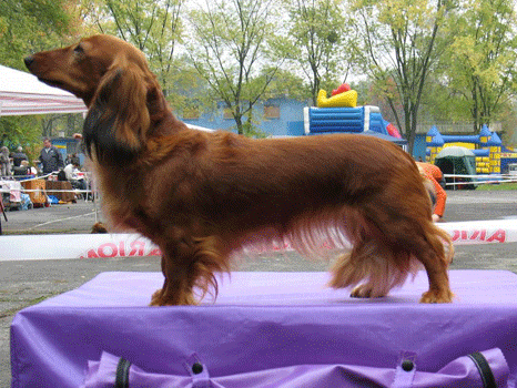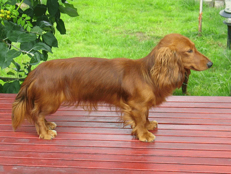 Oko tmavé, chrup úplný, skus nůžkový, typická čistě červená fenka, úměrné hlavy, rovný hřbet, méně hluboký hrudník, dostatečné osrstění