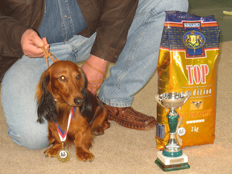 Obě "holky" získaly od pana rozhodčího Ing. Tomáška ohodnocení Výborná 2 ... Gena v rázu králičím ve třídě pracovní a Hanča v rázu trpasličím ve třídě otevřené