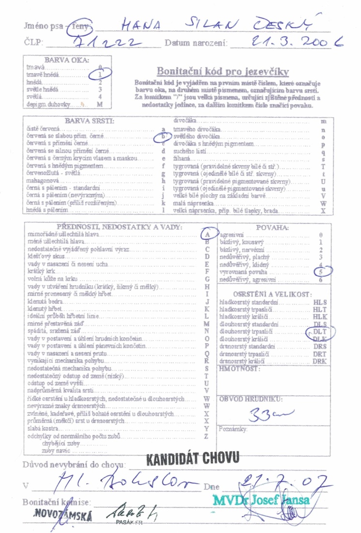 Nicméně po zdravotní stránce se nám až tolik nedařilo, neboť jí byl při běžné veterinární prohlídce diagnostikován šelest na srdíčku a od čtyř let jí byla nasazena léčba srdeční vady. Proto jsme se rozhodli Haničku v chovu nevyužít, byť měla splněné podmínky chovnosti a na doporučení veterináře jsme u ní nechali v pěti letech provést kastraci.