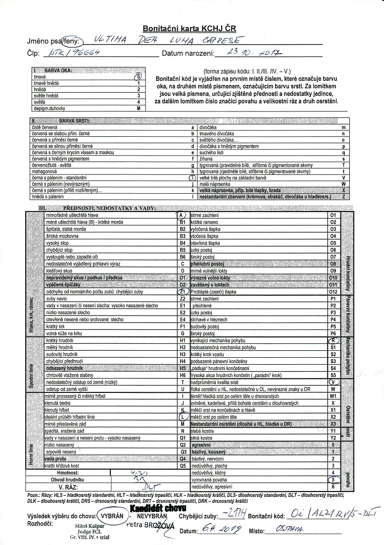 Ale vše dopadlo úspěšně a výsledkem bylo to, že jsme si po několika měsících dovezli z Itálie domů půlroční černopálenou jezevčí slečnu se vznešeným jménem Luna Caprese Ultima Dea. Chovatel Francesco Lamarca v době, kdy se tato štěnda narodila, věděl, že chov jako takový bude muset z osobních i zdravotních důvodů značně omezit a dokonce vážně zvažoval variantu, že s chovem úplně skončí .... A jelikož tušil, že na delší dobu bude nejspíše vrh "U" jedním z jeho posledních ... tak snad i proto právě jméno Ultima Dea, což v překladu znamená Poslední bohyně ... To jen tak na okraj ke zvláštnímu symbolickému jménu fenky